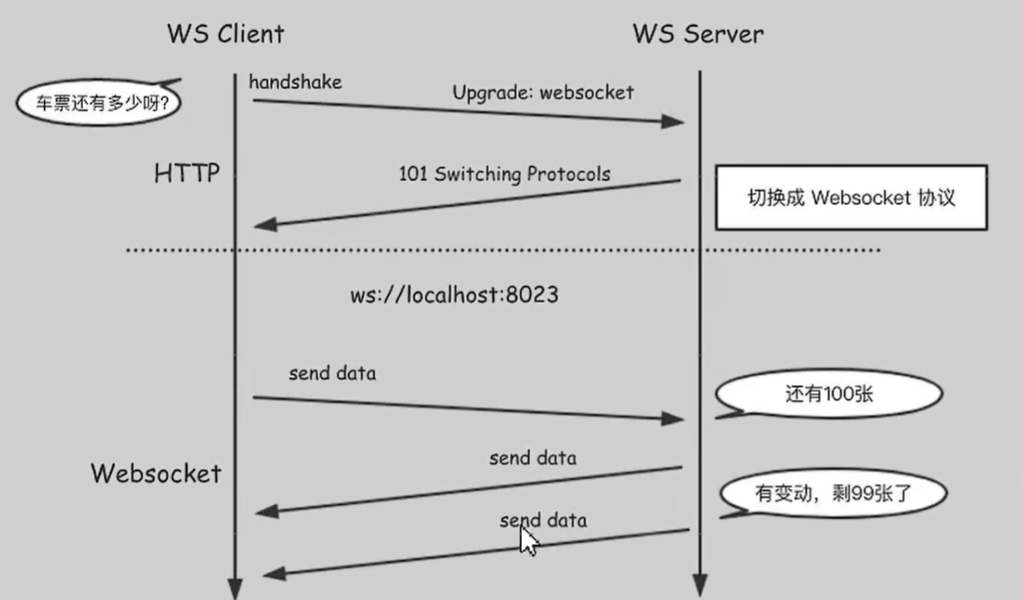 let soket = new WebSocket("ws://localhost:8889")浏览器链接服务器soket.send("hello server");客户端向服务器发消息 “hello server”socket.on("message")服务端监听到消息并触发回调,向客户端发送消息soket.onmessage客户端监听到服务端的相应,触发回调打印